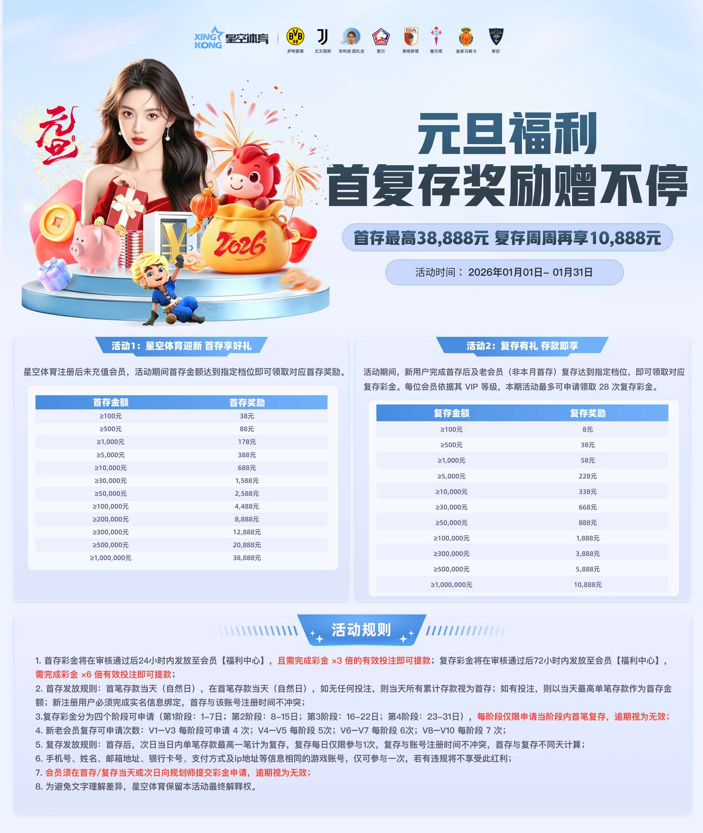 1月官方福利迎首存复存,vip忠实会员每阶段多次复存,复存最高10888,首存3倍流水,复存6倍,会员首复存彩金领取方式:登录游戏账号-选择【我的】-进入【福利中心】手动领取,详情查看下图:@本贴添加,